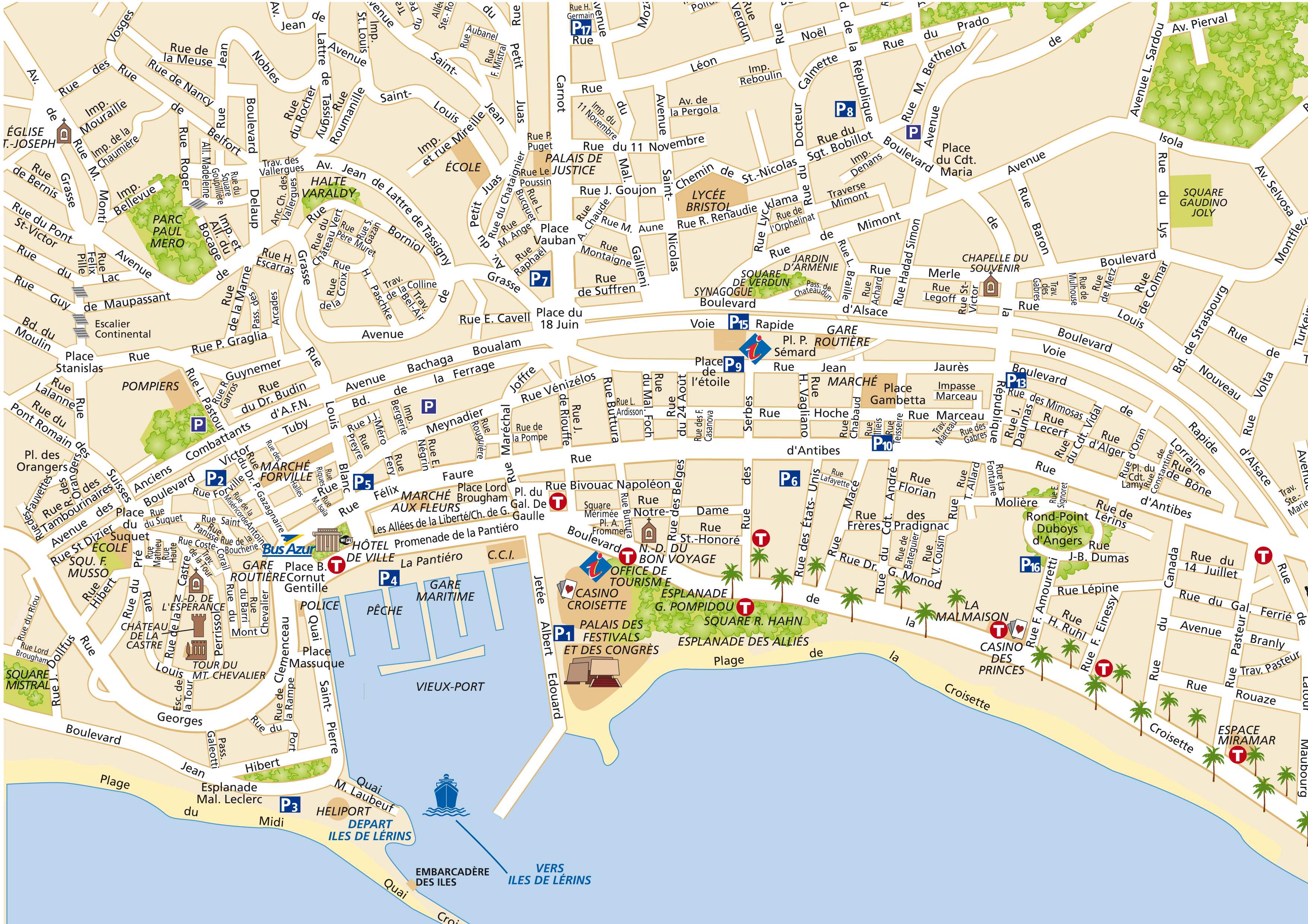 Die Croisette mit ihren Palmen ist natürlich ein Muß. Hier können Sie am Abend sitzen und die Dämmerung über Meer und Esterel-Gebirge hereinbrechen sehen, oder den öffentlichen Strand nahe dem neuen Palais des Festivals besuchen. Ein kleiner Bummel am Hafen entlang kann sich von hier anschließen. Piano-Bars oder Casinos bieten viele Möglichkeiten die Nacht zu verkürzen.