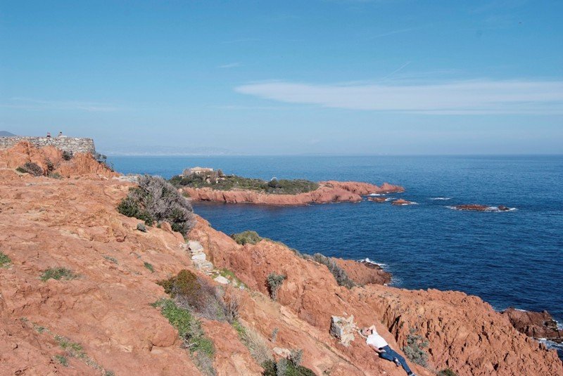 Anfahrt über Frejus, St. Raphael, die Küstenstraße durch Agay und Antheor. Einige Kilometer hinter Antheor liegt rechts ein Parkplatz an den alten Kasematten. Nördlich von dort liegt das Cap Roux. Auf der Straße ca. 50 m zurück liegt auf der anderen Seite eine Forststraße mit Schranke. Hier beginnt der Weg.