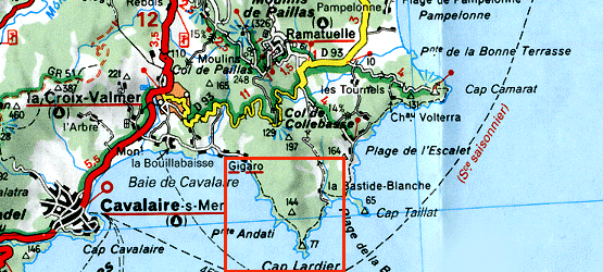 Anfahrt über Ste. Maxime, La Foux, La Croix Valmer nach Gigaro. Die Abzweigung nach Gigaro geht an der Ampel in Croix Valmer nach links. Bis ans Ende der Straße in Gigaro fahren und dann links zum Parkplatz. Der Weg beginnt am Ende des Strandes (s. Karten unten).