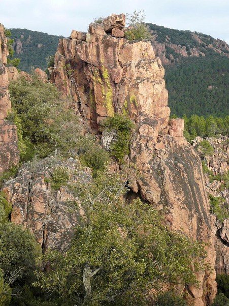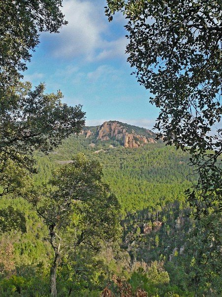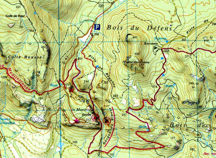 Anfahrt über Roquebrune, nach dem Ortsende Weiterfahrt Richtung Bouverie, durch den Ort hindurch bis zur Kreuzung mit der D47 (s. Karte unten). Hier rechts abbiegen – Richtung Bagnols en Foret – und die Straße bergauf fahren. Oben gibt es einen Parkplatz mit Aussicht über das Tal (auf der rechten) und einen Teil der Schlucht (auf der linken Straßenseite). Bergab fahren bis zum Parkplatz auf der rechten Seite. Hier beginnt der Weg.