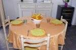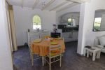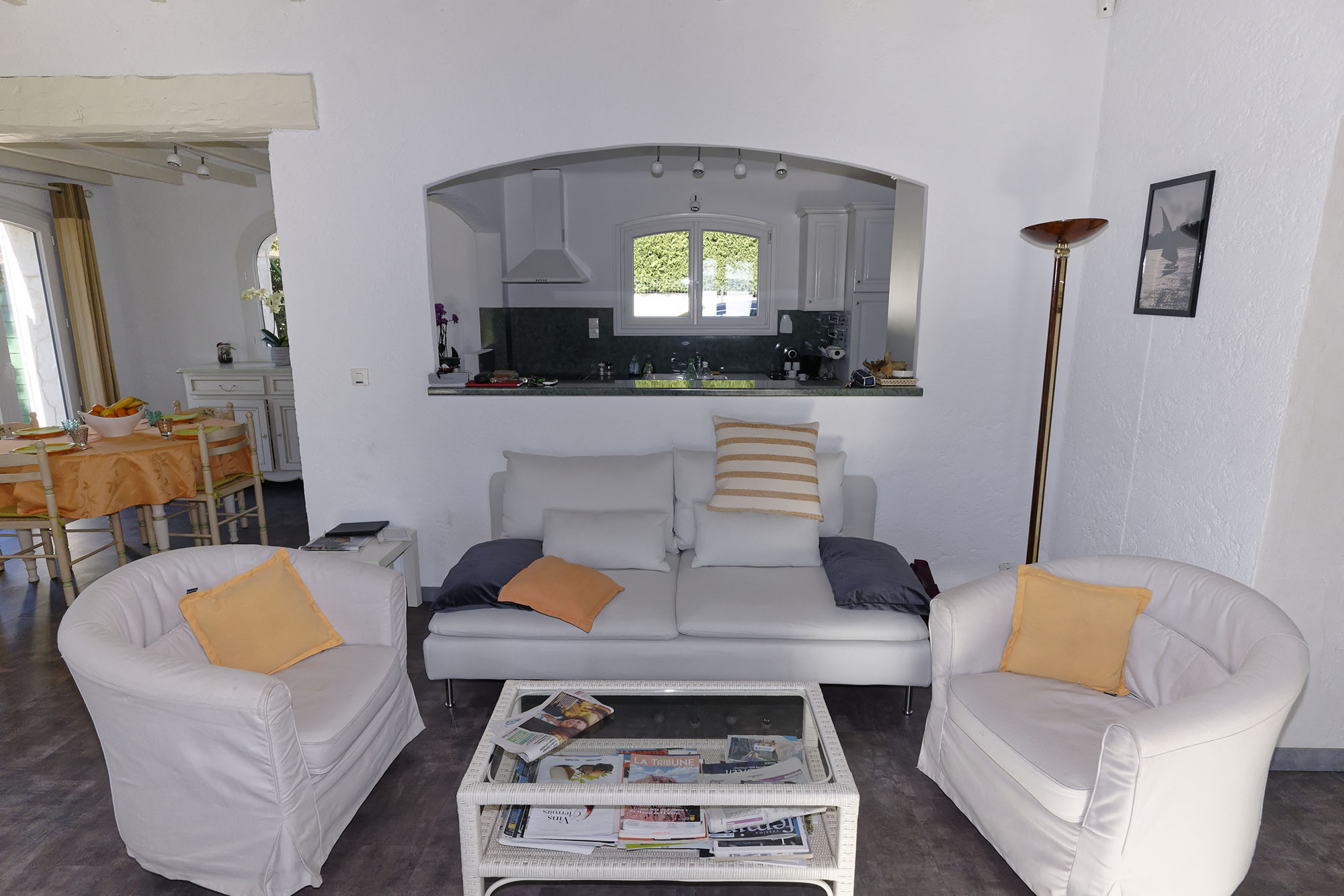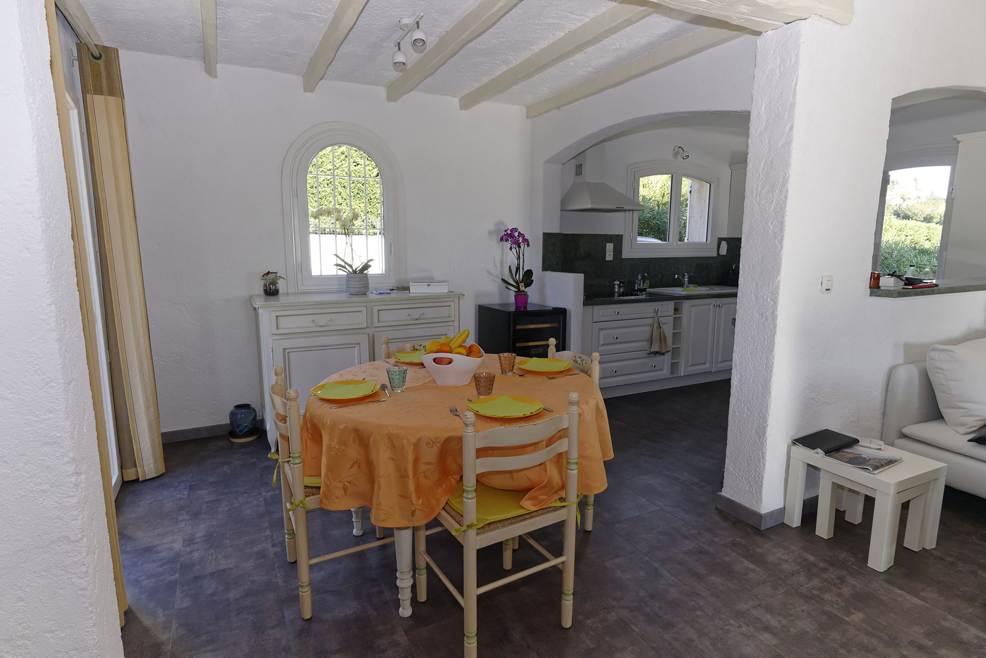 Auf der rechten Seite des ebenerdigen Hauses liegen ein Wohn-Eßzimmer (45,50 qm) mit Kamin und Fernsehgerät und eine halboffene Küche. Es gibt einen Ausgang auf eine überdachte Terrasse (17,80 qm) und in den Garten. Die Küche mit Kühl-Gefrierkombination, Gasherd, elektrischem Backofen, Spül- und Waschmaschine, Nespresso Maschine ist durch eine Bar vom Wohnraum abgetrennt .