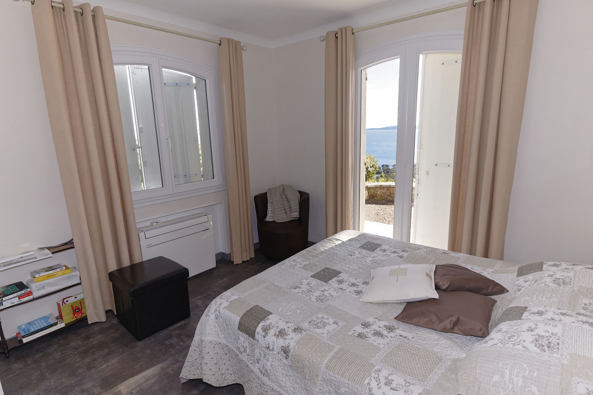 Der Schlaftrakt des Hauses liegt auf der linken Seite. Er besteht aus drei Schlafzimmern und zwei Bädern. Eines der Schlafzimmer (10 qm) hat ein französiches Bett (160 cm breit) und Wandschrank. Ein Schlafzimmer (9,80 qm) mit Doppelbett und zwei Matratzen (160 cm breit) sowie ein Schlafzimmer mit französischem Bett (140 cm breit) und Wandschrank. Zwei Schlafzimmer haben Meerblick, eines davon hat eine Klimaanlage. Ein Bad mit Dusche und Waschbecken. Ein zweites Bad mit Dusche, Waschbecken, WC. Eine getrennte Toilette.