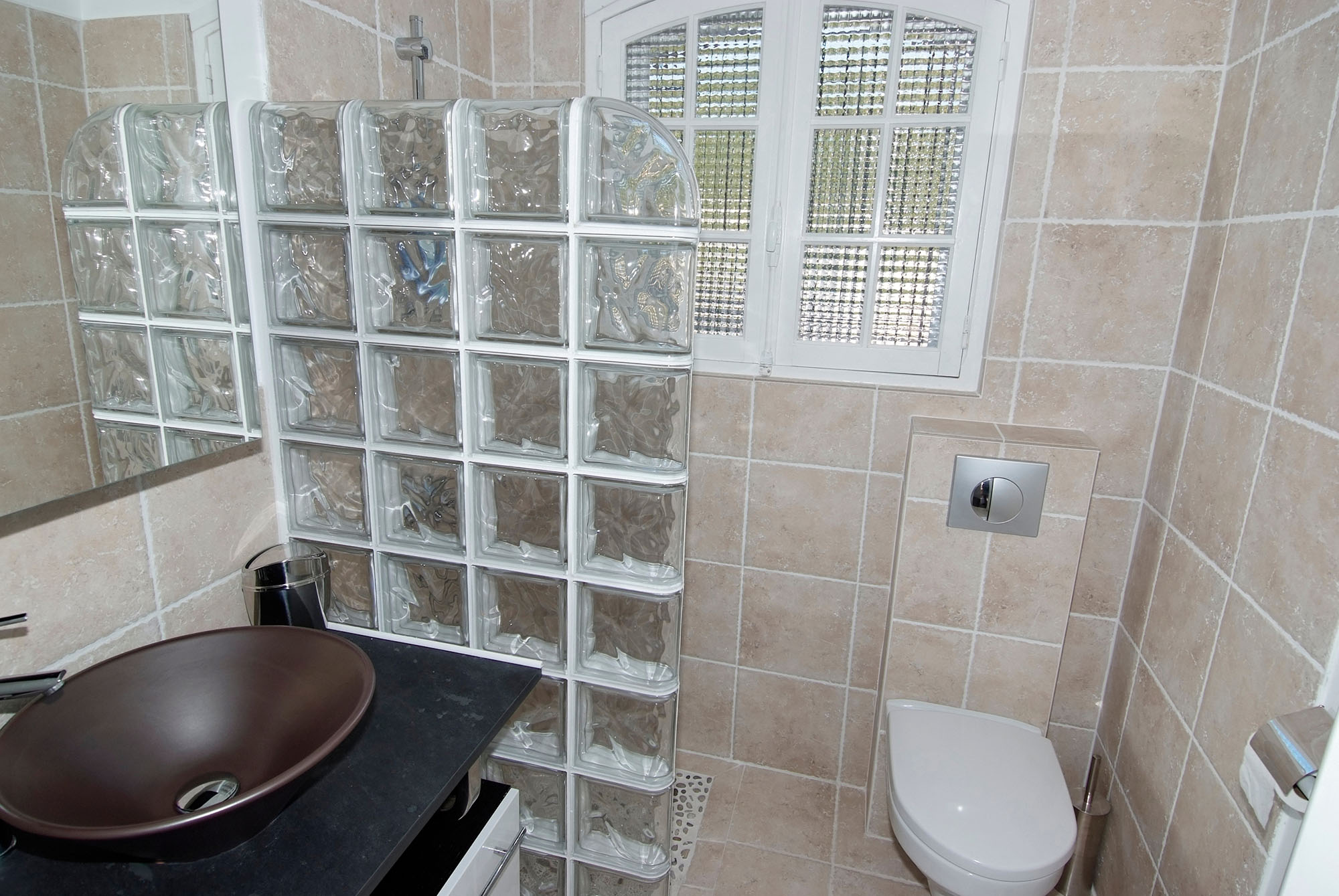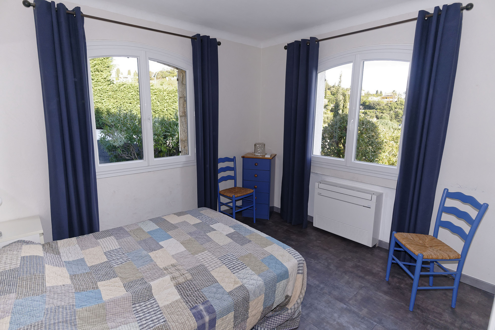 Der Schlaftrakt des Hauses liegt auf der linken Seite. Er besteht aus drei Schlafzimmern und zwei Bädern. Eines der Schlafzimmer (10 qm) hat ein französiches Bett (160 cm breit) und Wandschrank. Ein Schlafzimmer (9,80 qm) mit Doppelbett und zwei Matratzen (160 cm breit) sowie ein Schlafzimmer mit französischem Bett (140 cm breit) und Wandschrank. Zwei Schlafzimmer haben Meerblick, eines davon hat eine Klimaanlage. Ein Bad mit Dusche und Waschbecken. Ein zweites Bad mit Dusche, Waschbecken, WC. Eine getrennte Toilette.