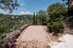 Die große Südterrasse mit fabelhafter Aussicht auf den Golf von St. Tropez. Ein Teil der Terrasse ist überdacht. Ein elektrischer Grill ist vorhanden. Von der Terrasse führt eine Treppe zum tiefergelegenen Swimmingpool und zum Boulespielplatz. Vom Pool haben Sie ebenfalls einen schönen Blick aufs Meer.