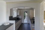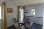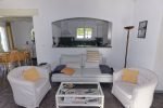 Pastourelle Terrasse und AusblickAuf der rechten Seite des ebenerdigen Hauses liegen ein Wohn-Eßzimmer (45,50 qm) mit Kamin und Fernsehgerät und eine halboffene Küche. Es gibt einen Ausgang auf eine überdachte Terrasse (17,80 qm) und in den Garten. Die Küche mit Kühl-Gefrierkombination, Gasherd, elektrischem Backofen, Spül- und Waschmaschine, Nespresso Maschine ist durch eine Bar vom Wohnraum abgetrennt .
