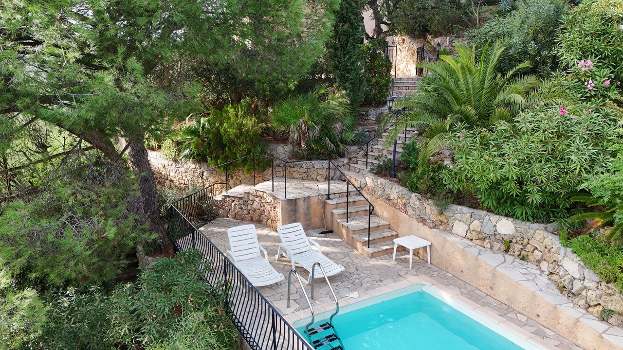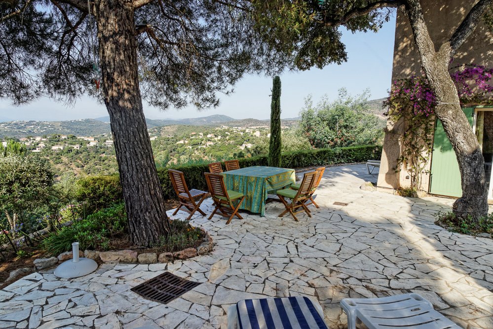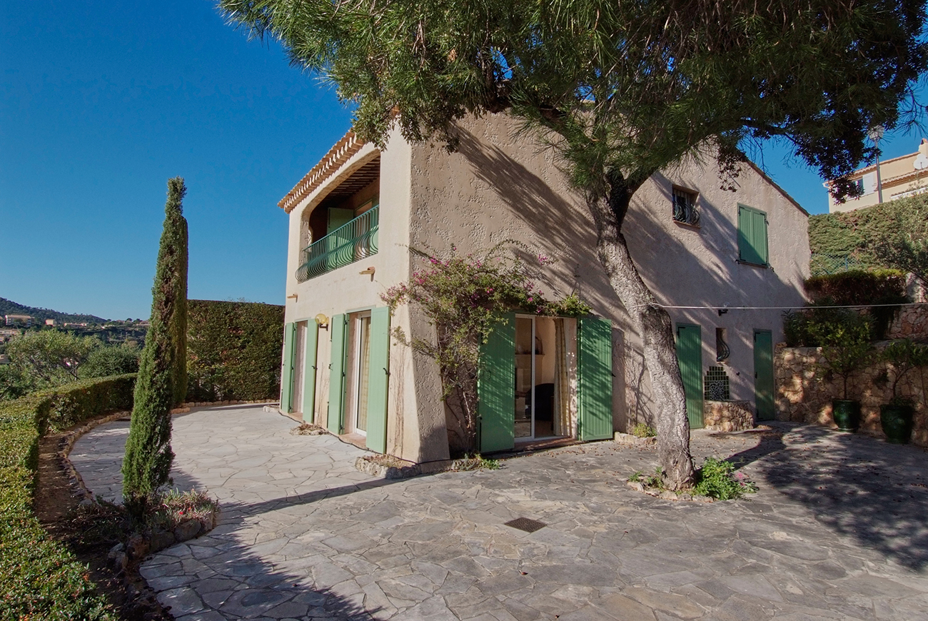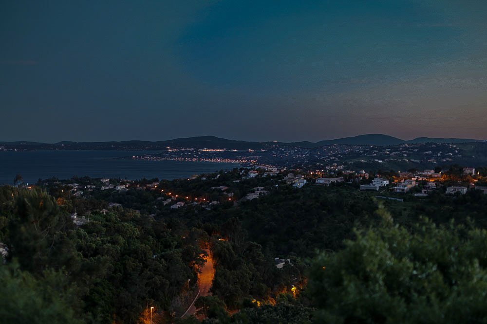 Große Aussichtsterrasse mit schönem Blick auf den Golf von St. Tropez. Heizbarer Pool.