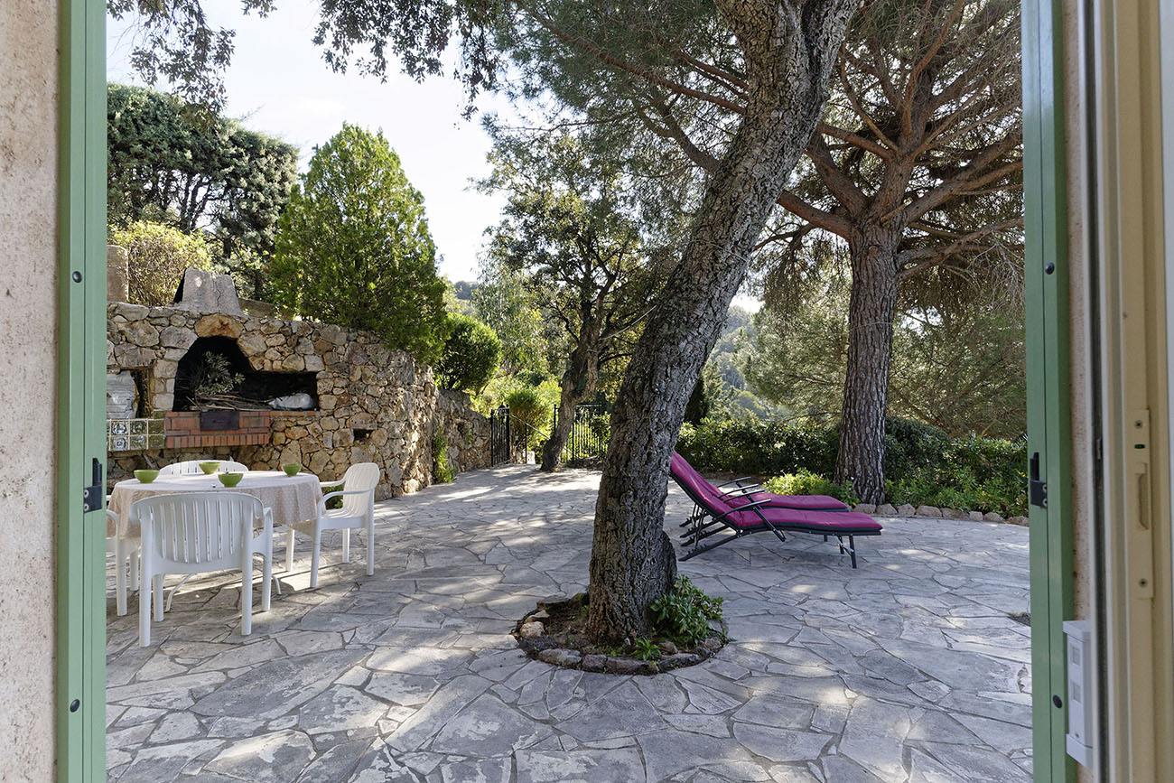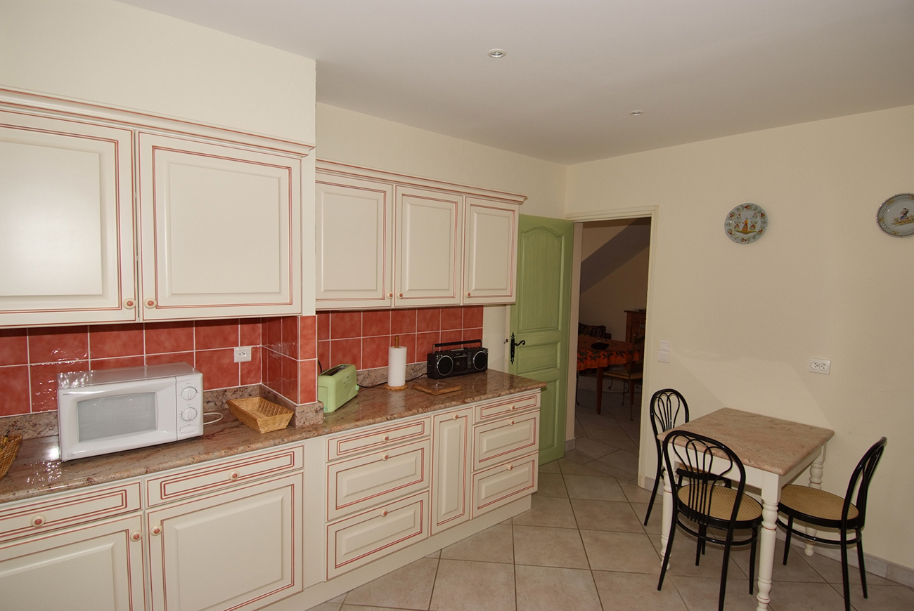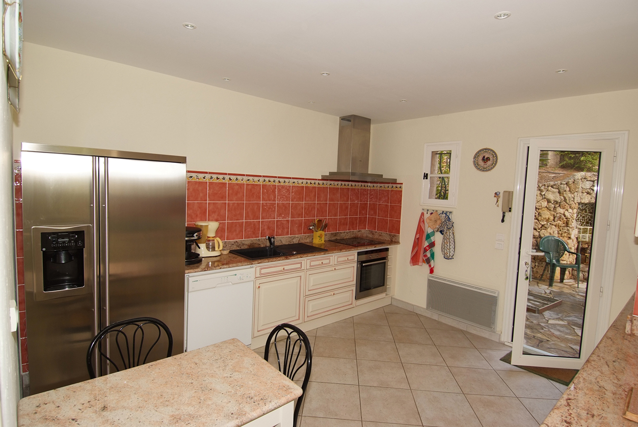 Ricoulette TerrasseAuf der Gartenebene liegt ein großes Wohnzimmer mit Kamin, Sat-Fernseher und Hifianlage, Sitz- und Essecke, das sich auf die große Terrasse mit Steinplatten und Grill sowie den Garten öffnet. Die Küche ist mit Spülmaschine, Mikrowelle, Kochfeld, Backofen, 3 Kaffeemaschinen (Filter-, Espresso-, Nespresso-) und amerikanischem Kühlschrank ausgestattet. Sie öffnet sich ebenfalls auf die Terrasse und den Garten. Waschküche mit Waschmaschine und Tiefkühltruhe. Auf dieser Ebene liegt auch ein Schlafzimmer mit 2 Betten (je 0,90 m breit) und Ausgang auf die Terrasse. Dazu gehört ein Bad mit Dusche und getrennter Toilette.