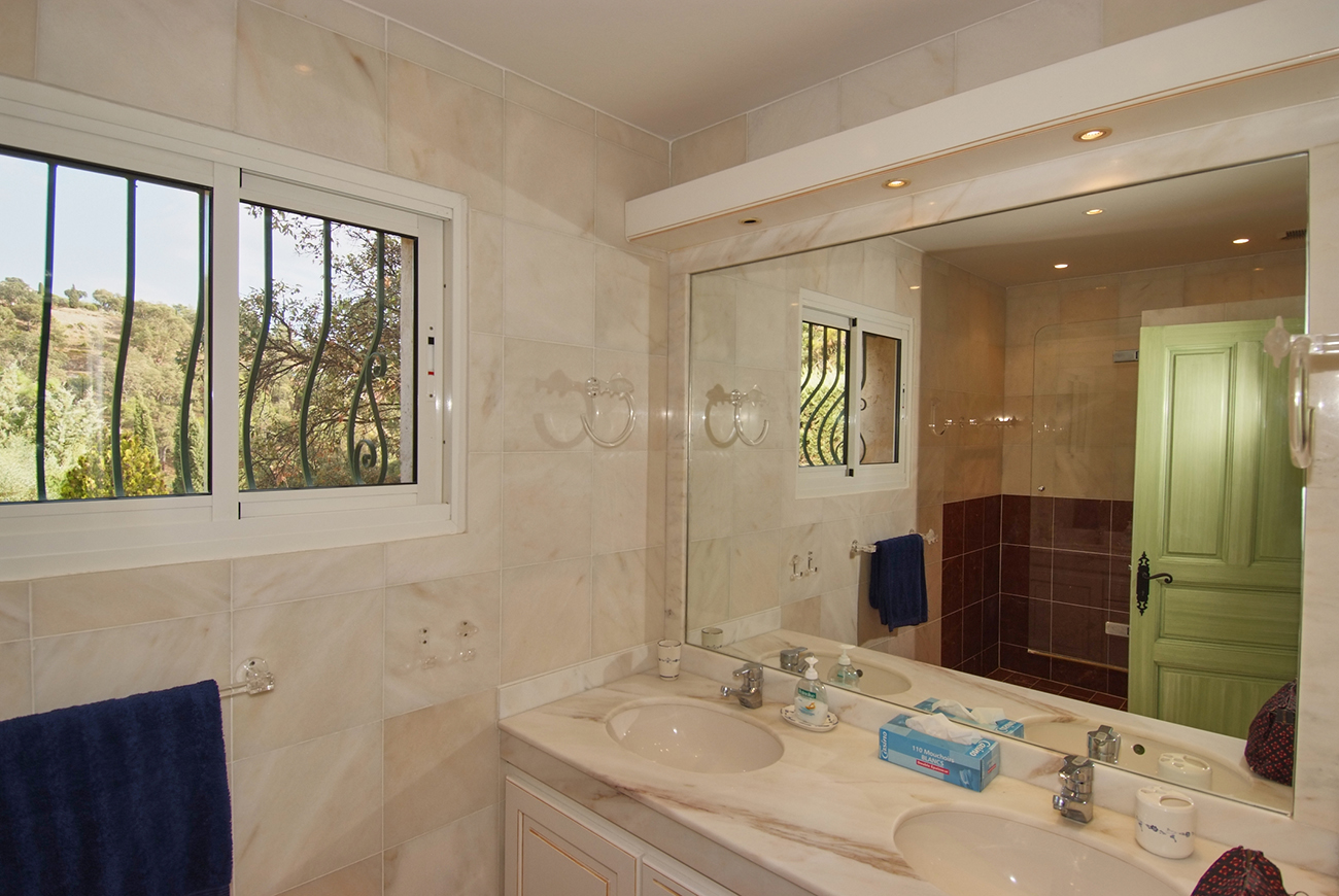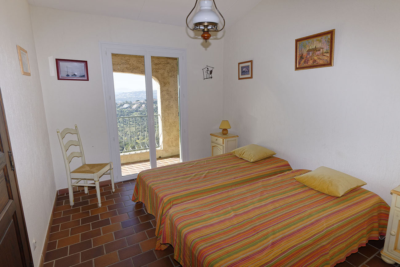 Ricoulette BlickAuf der oberen Ebene befinden sich drei Schlafzimmer mit Klimaanlage und ein Bad. Ein Schlafzimmer hat 2 Betten (je 0,90 m breit), Einbauschrank, Zugang zum Balkon und Meerblick. Daneben liegt ein weiteres Schlafzimmer mit Zugang zum Balkon, französischem Bett (1,40 m breit), Einbauschrank und Meerblick. Ein Bad mit zwei Waschbecken und Badewanne sowie eine getrennte Toilette schließen sich an. Das dritte Schlafzimmer hat ein französisches Bett (1,40 m) und einen Einbauschrank. Eine Innentreppe führt zum unteren Geschoß.