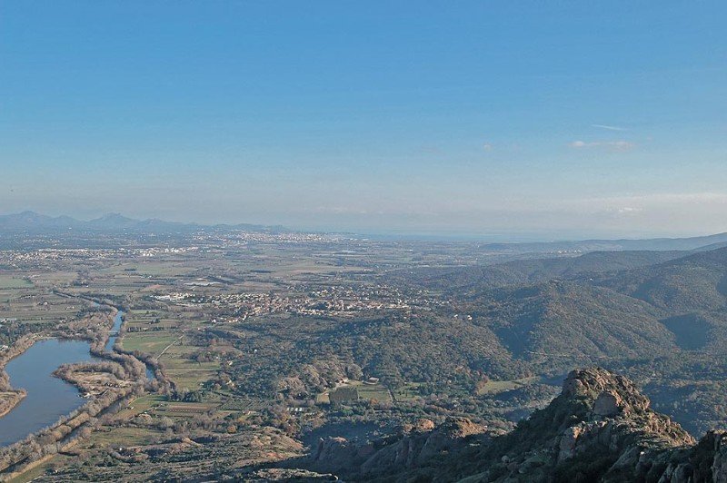 Rocher Rouge Blick nach Osten vom GipfelAnfahrt über Roquebrune. Nach dem Ortsende – vor der Brücke über den Argens – links abbiegen (s. Karte unten) und der schmalen Straße mehrere Kilometer folgen. Wenn die Bergkette wie im Bild links unten sichtbar ist und einige Häuser vor Ihnen liegen, parken Sie. Der Weg beginnt zwischen dem ersten und dem zweiten Haus. Der kürzere (markierte) Weg zweigt nach rechts, der lange nach links ab (in großen Teilen unwegsam).