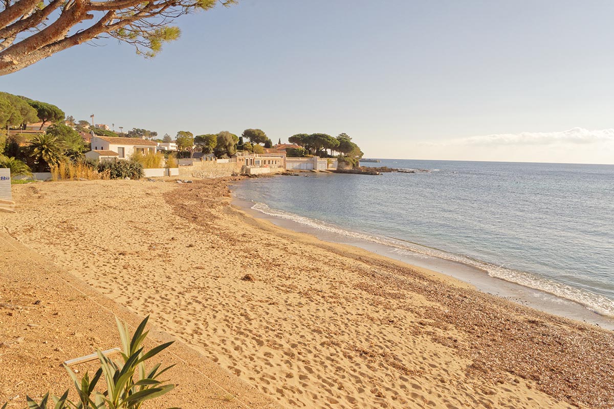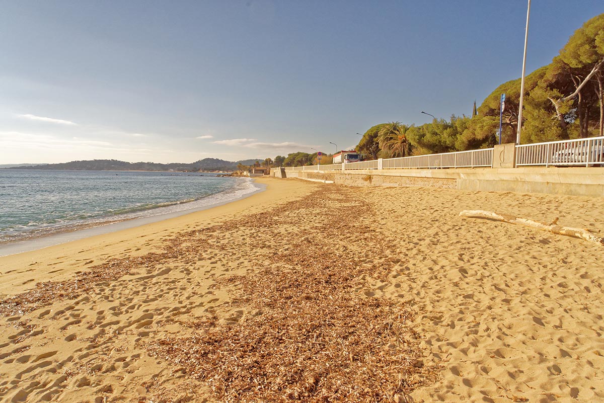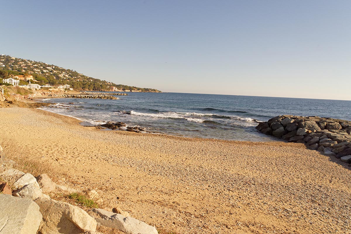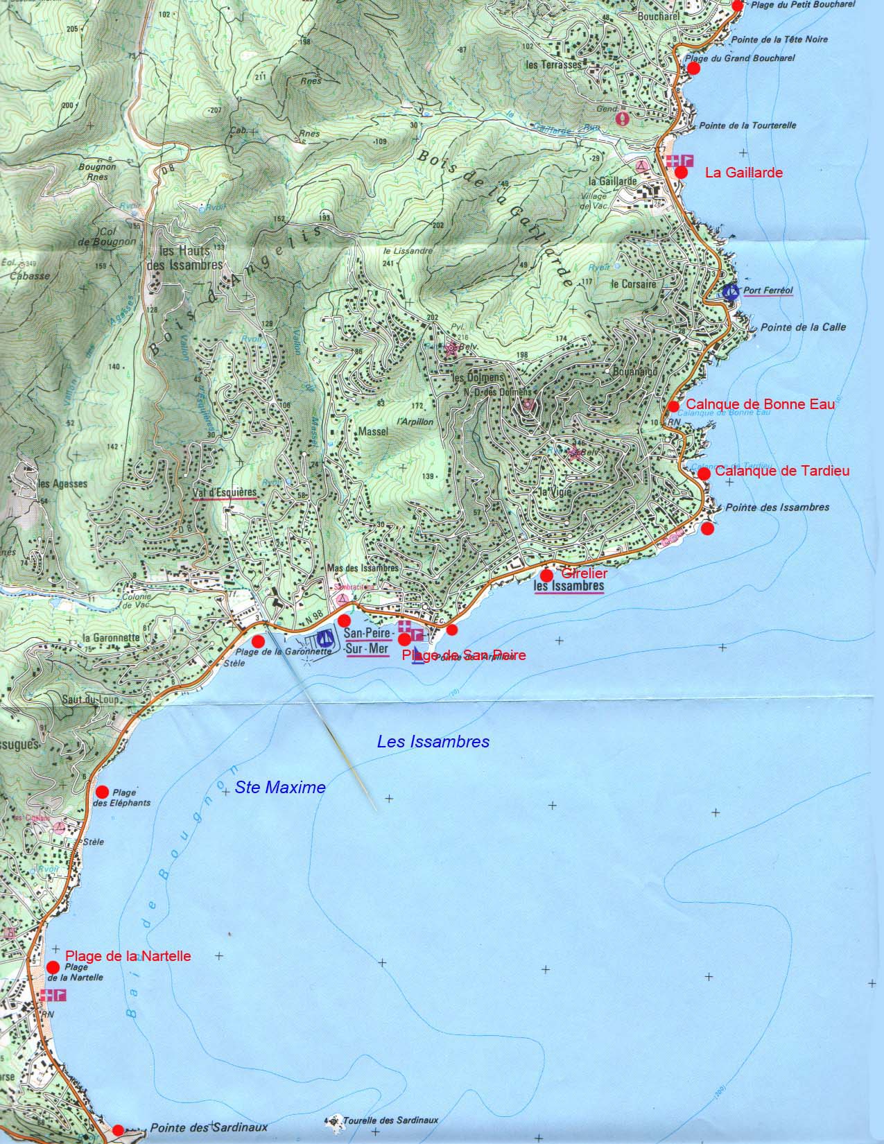 Die Lage einiger Strände und Buchten ist in der Karte mit rotem Text markiert. Der große Strand von St. Aygulf liegt ca. 2 km weiter nördlich. Bis auf Calanque de Bonne Eau, Girelier, die Ostseite von San Peire und Sardineaux sind die abgebildeten Strände Sandstrände. Privatstrände mit Restaurant gibt es an der Gaillarde, bei Peiras, Garonnette, an zwei Stränden vor la Nartelle und an der Nartelle. Klicken Sie auf ein Bild zum Start.