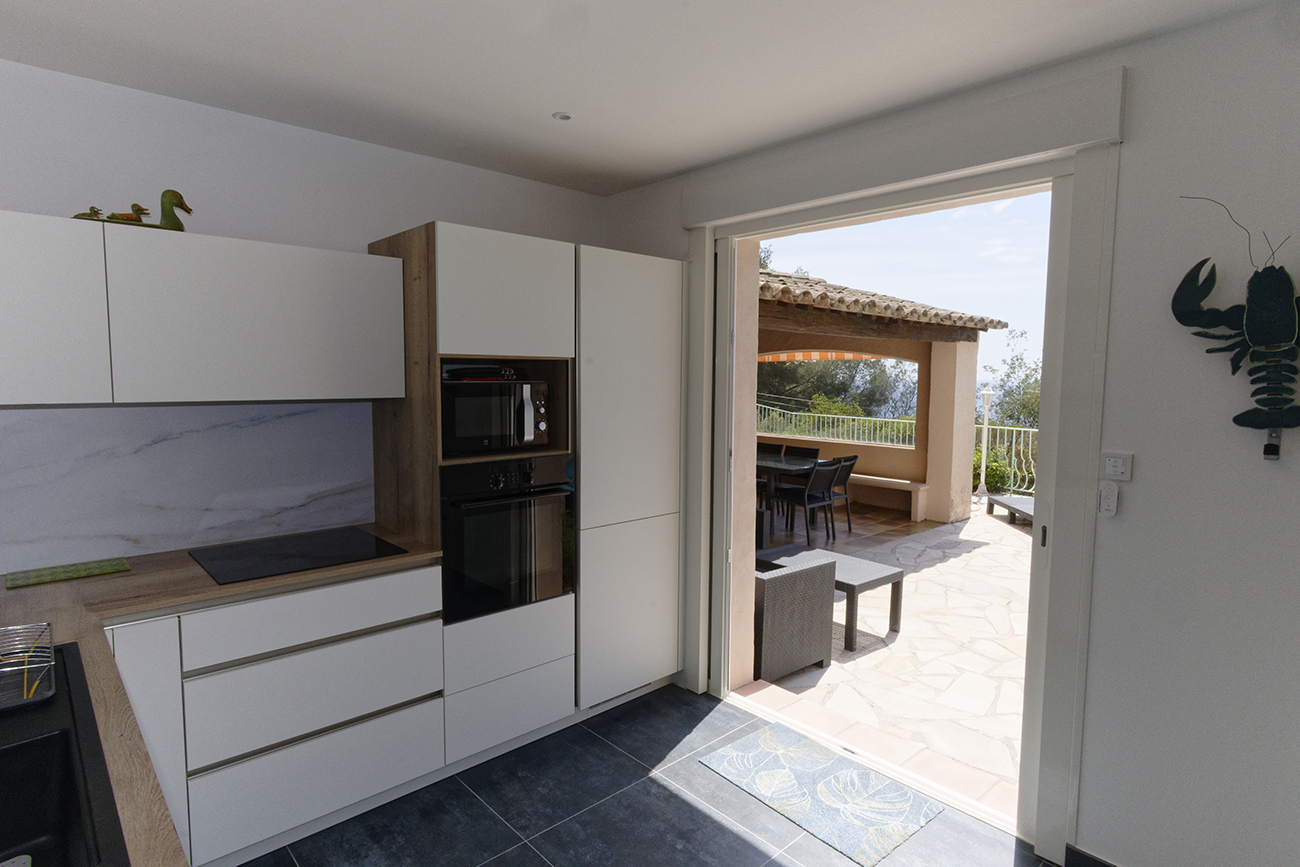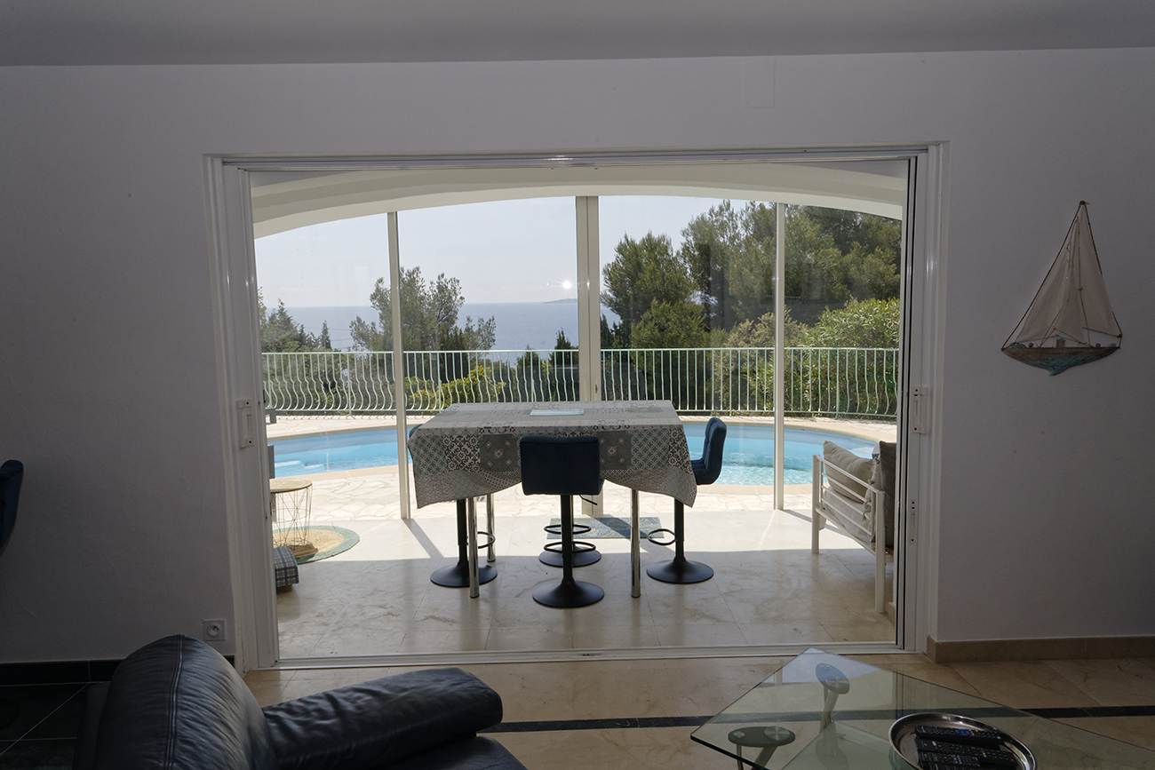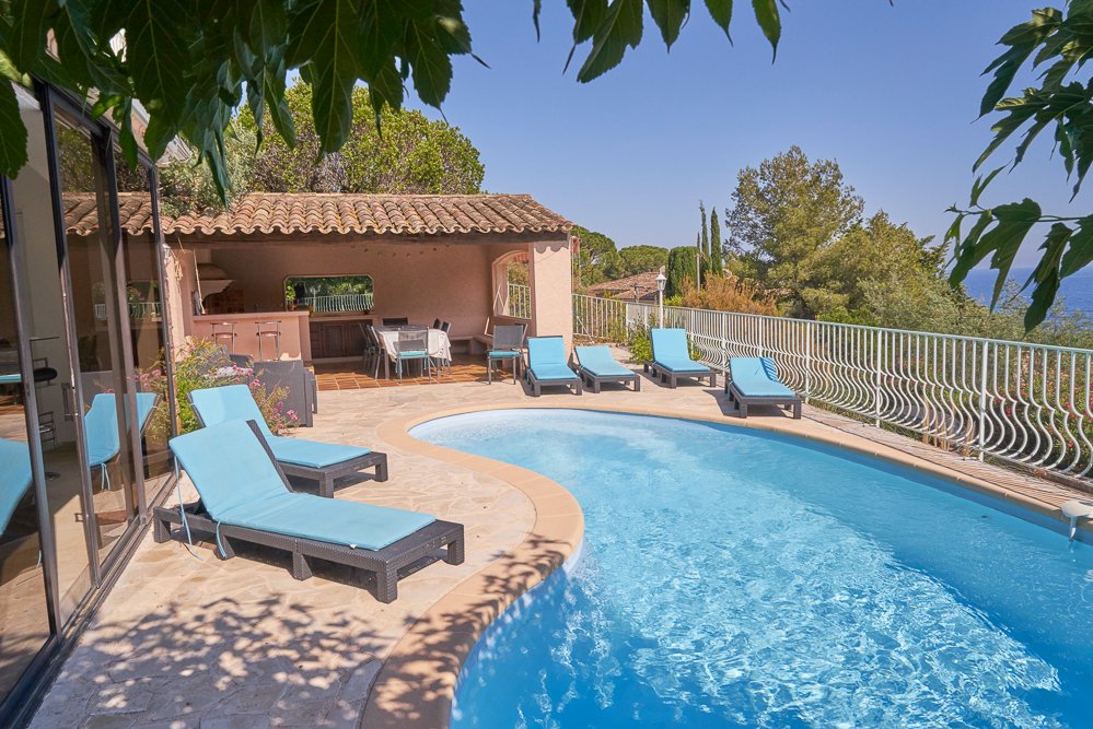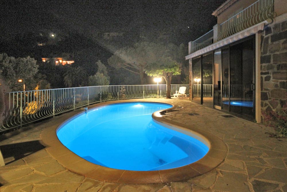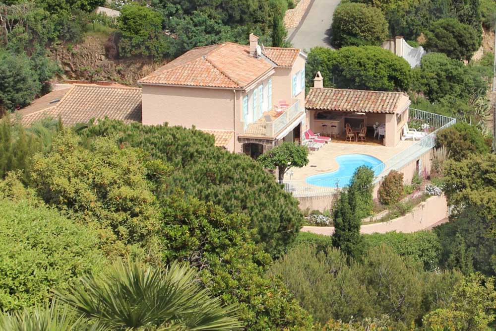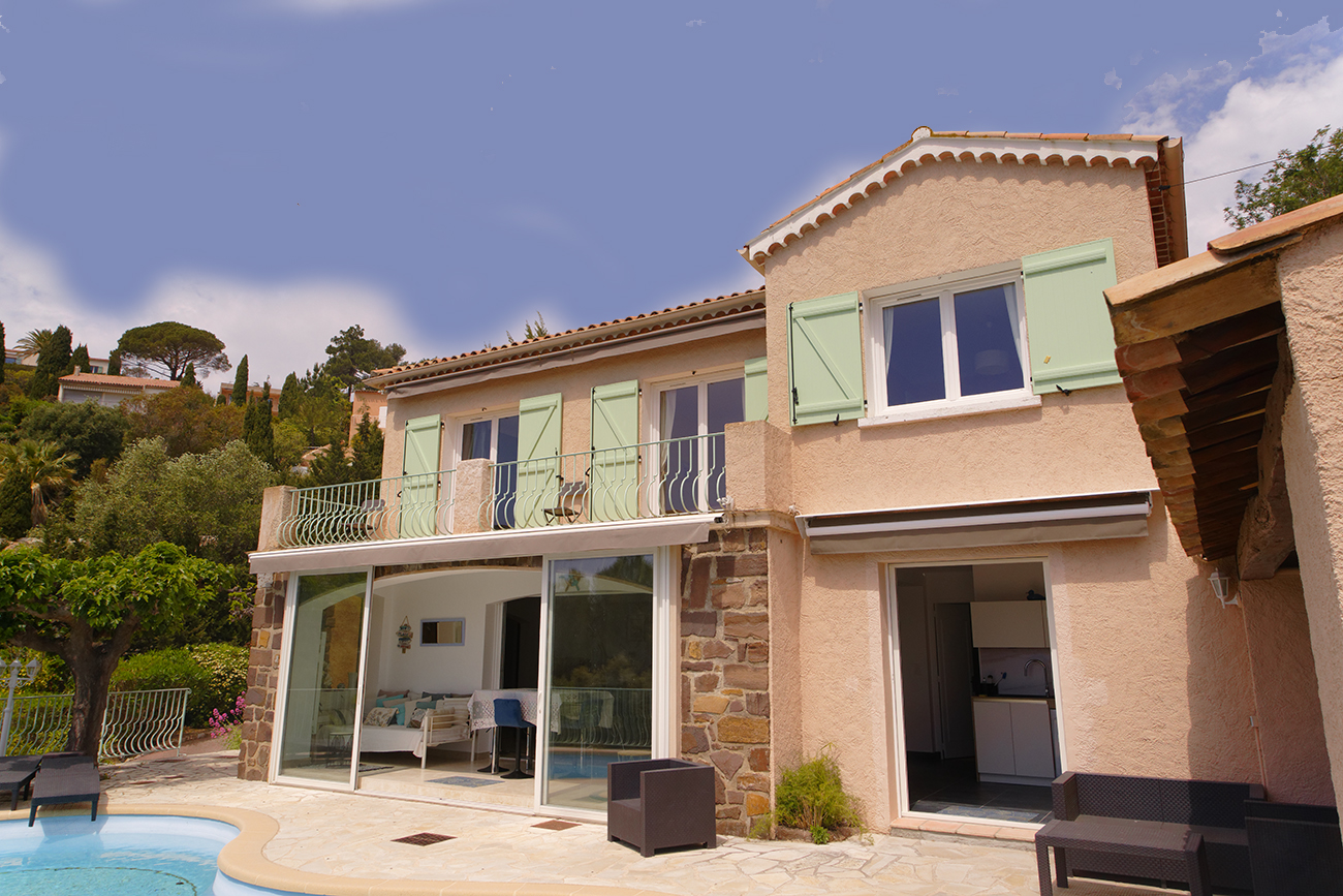 Nach Süden ausgerichtetes, ruhig gelegenes, sonniges Haus auf zwei Ebenen mit 140 qm Wohnfläche. Vier Schlafzimmer, zwei Bäder, schöner Meerblick auf den Golf von St. Tropez und Pool (Nierenform ca. 3 m x 8 m)