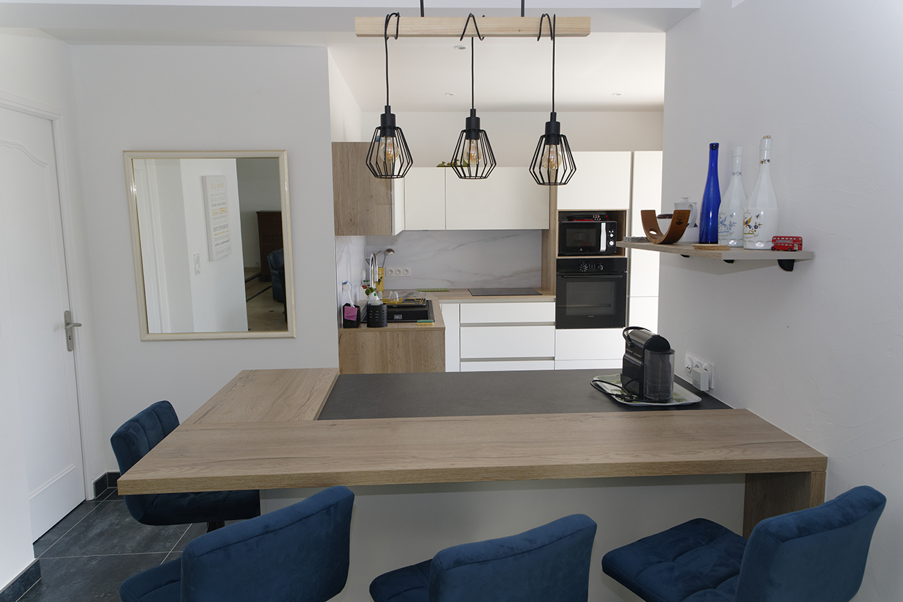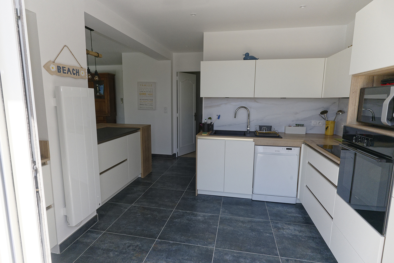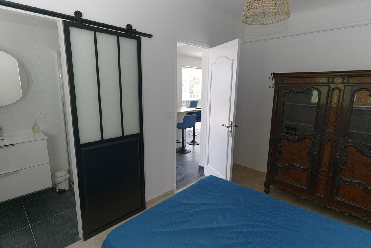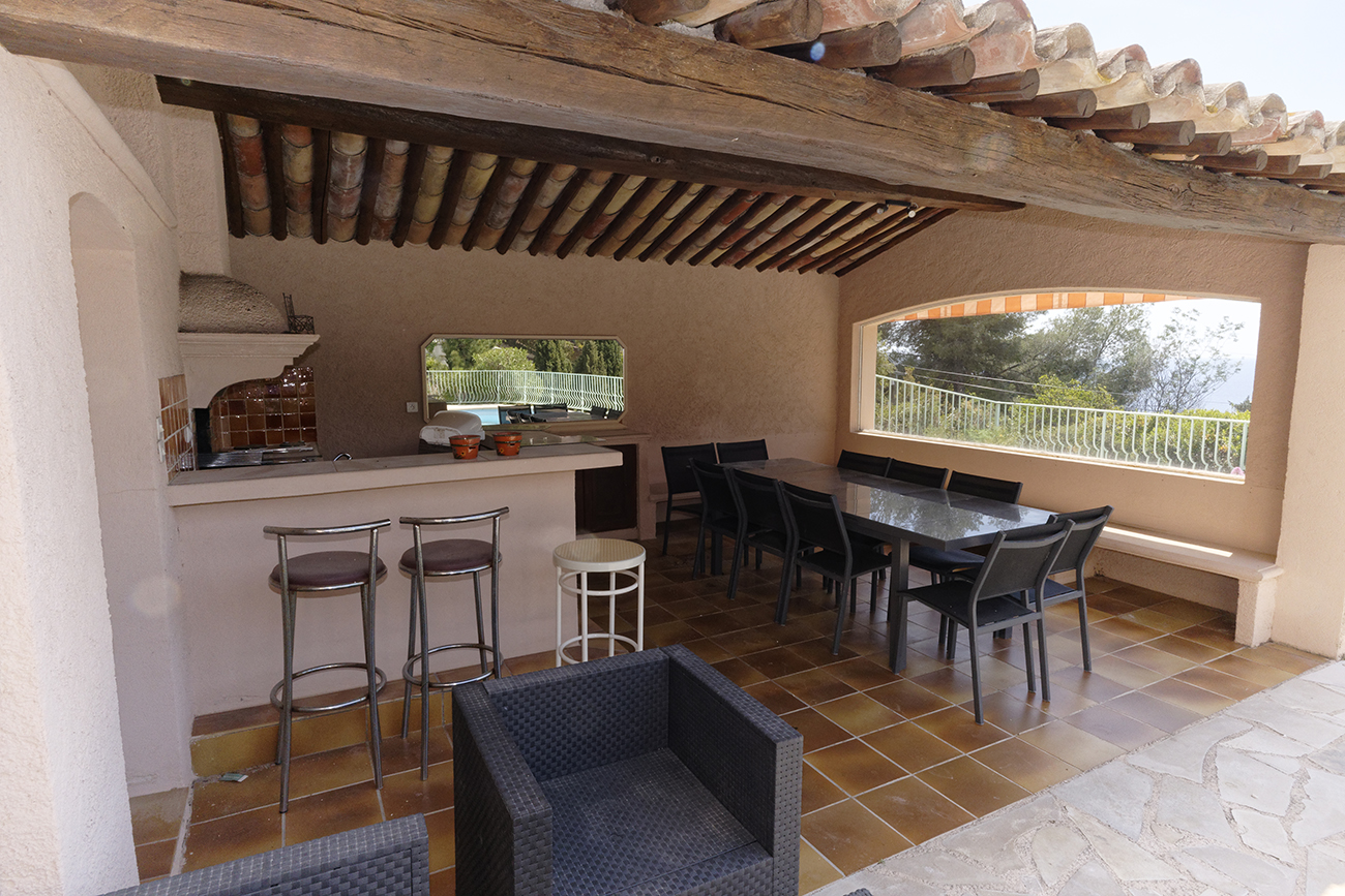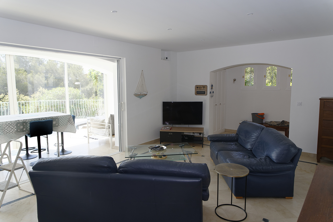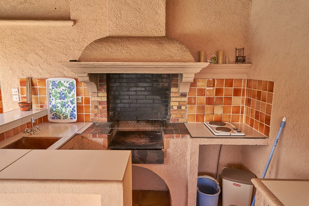 Der Eingang führt in den Wohnraum mit großer Sitzecke und Klimaanlage. Neben dem Wohnzimmer liegt ein kleiner Schlafraum mit Bett (190 cm x 140 cm), ein Bad mit Waschbecken, Dusche und Toilette sowie die Küche. Sie ist mit Ceran-Kochfeld, Backofen Mikrowelle, Geschirrspülmaschine und Kühl-Gefrierkombination ausgestattet (eine Waschmaschine befindet sich in der ehemaligen Garage). Vor dem Wohnzimmer liegt ein durch Schiebefenster abtrennbarer Raum mit Ausgang zur Poolterrasse. Neben dem Pool liegt eine überdachte Sommerküche mit Essecke. In der Sommerküche gibt es einen Holzkohlengrill.