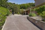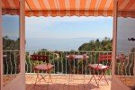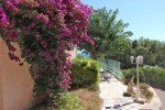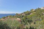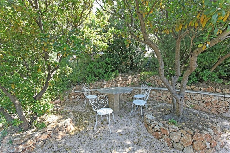 Ein Pfad führt zur Gartenterrasse über dem Haus. Im Schatten von Bäumen haben Sie einen Blick auf Haus und Meer.