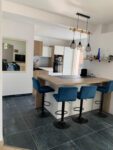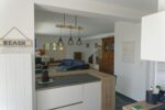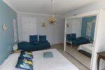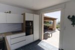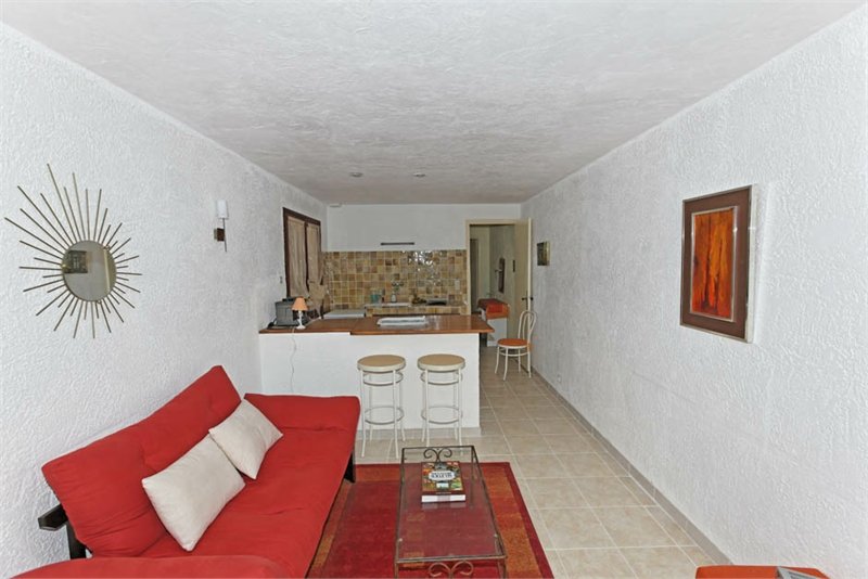 Der Eingang führt in den Wohnraum mit großer Sitzecke und Klimaanlage. Neben dem Wohnzimmer liegt ein kleiner Schlafraum mit Bett (190 cm x 140 cm), ein Bad mit Waschbecken, Dusche und Toilette sowie die Küche. Sie ist mit Ceran-Kochfeld, Backofen Mikrowelle, Geschirrspülmaschine und Kühl-Gefrierkombination ausgestattet (eine Waschmaschine befindet sich in der ehemaligen Garage). Vor dem Wohnzimmer liegt ein durch Schiebefenster abtrennbarer Raum mit Ausgang zur Poolterrasse. Neben dem Pool liegt eine überdachte Sommerküche mit Essecke. In der Sommerküche gibt es einen Holzkohlengrill. Ein getrennter Eingang führt zu einem Studio mit Sitzecke, Kochnische, Schlafzimmer mit mobiler Klimaanlage und Bad mit Waschbecken, Dusche und Toilette. Rechts neben dem Studio liegt die ehemalige Garage mit Waschmaschine.