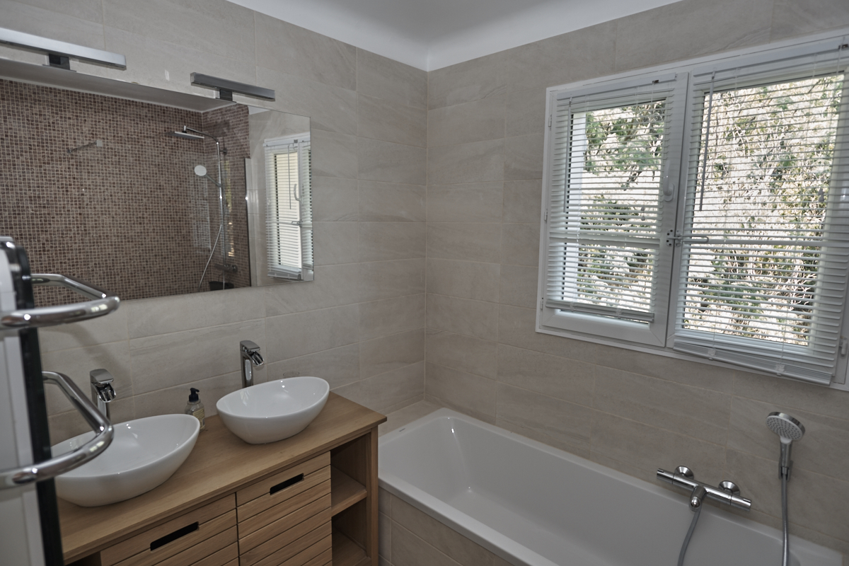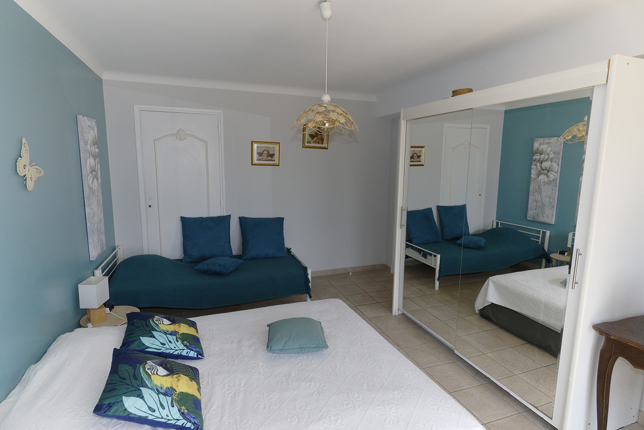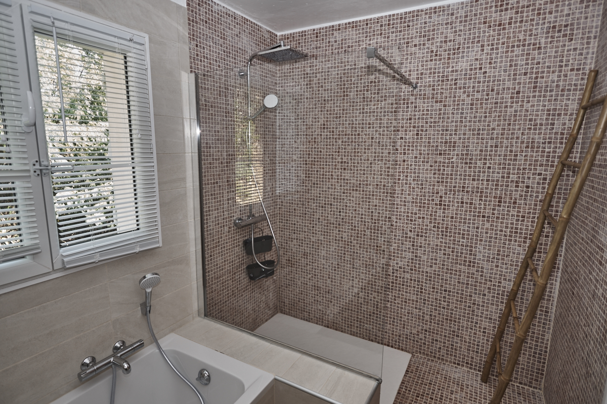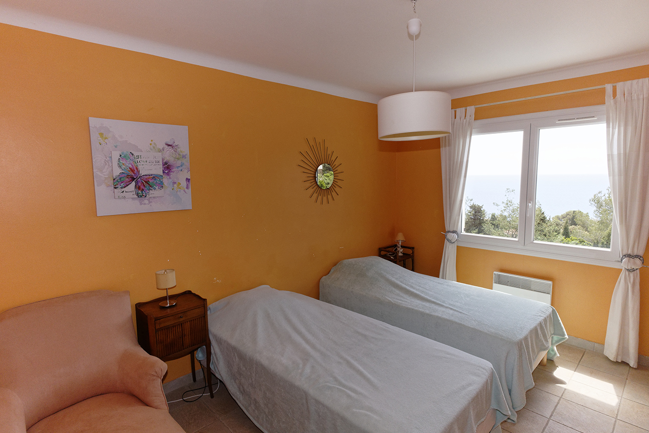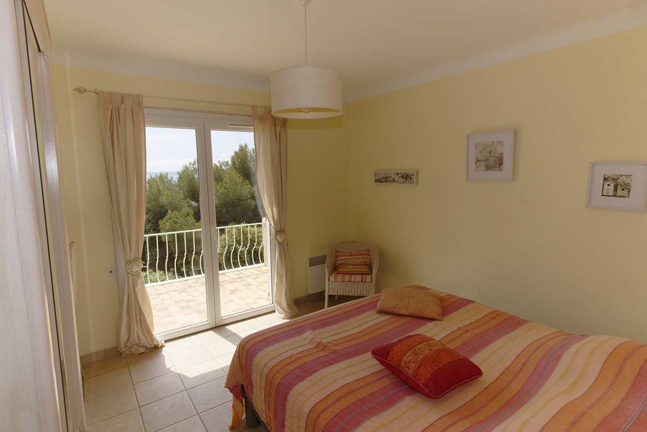 Eine Treppe führt vom Wohnraum in den ersten Stock mit drei Schlafzimmern, einem Bad und einer getrennten Toilette. Der Korridor ist klimatisiert und kühlt bei geöffneten Türen auch die Schlafzimmer. Vor zwei der Schlafzimmer liegt ein Balkon mit schönem Meerblick. Diese Schlafzimmer haben französische Betten (1,90 m x 1,60 m). Das dritte Schlafzimmer hat 2 getrennte Betten (190 cm x 90 cm). Das Bad ist mit 2 Waschbecken, Badewanne und getrennter Dusche ausgestattet.