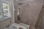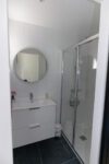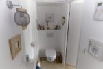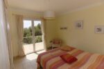 Eine Treppe führt vom Wohnraum in den ersten Stock mit drei Schlafzimmern, einem Bad und einer getrennten Toilette. Der Korridor ist klimatisiert. Vor zwei der Schlafzimmer liegt ein Balkon mit schönem Meerblick. Diese Schlafzimmer haben französische Betten (1,90 m x 1,60 m). Das dritte Schlafzimmer hat 2 getrennte Betten (190 cm x 90 cm). Das Bad ist mit 2 Waschbecken, Badewanne und getrennter Dusche ausgestattet.