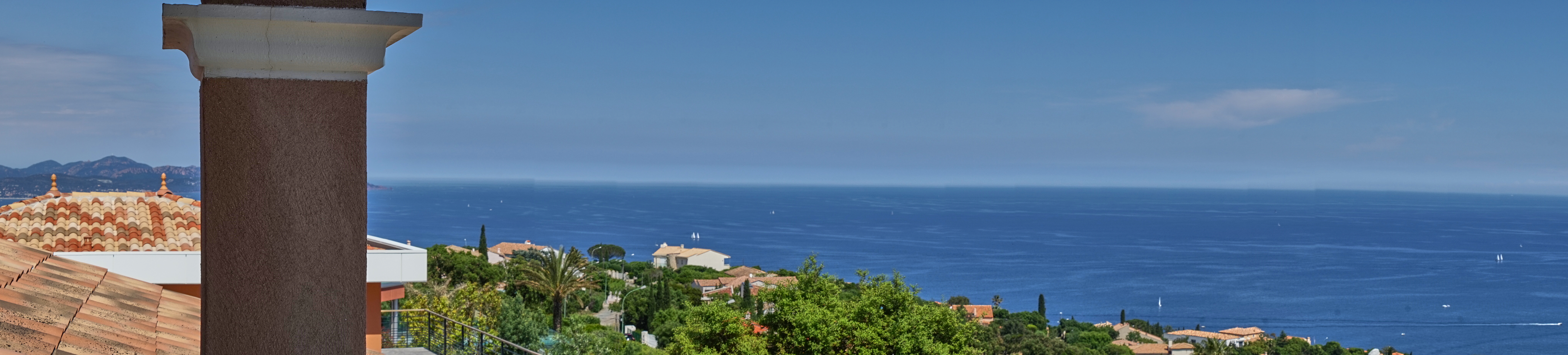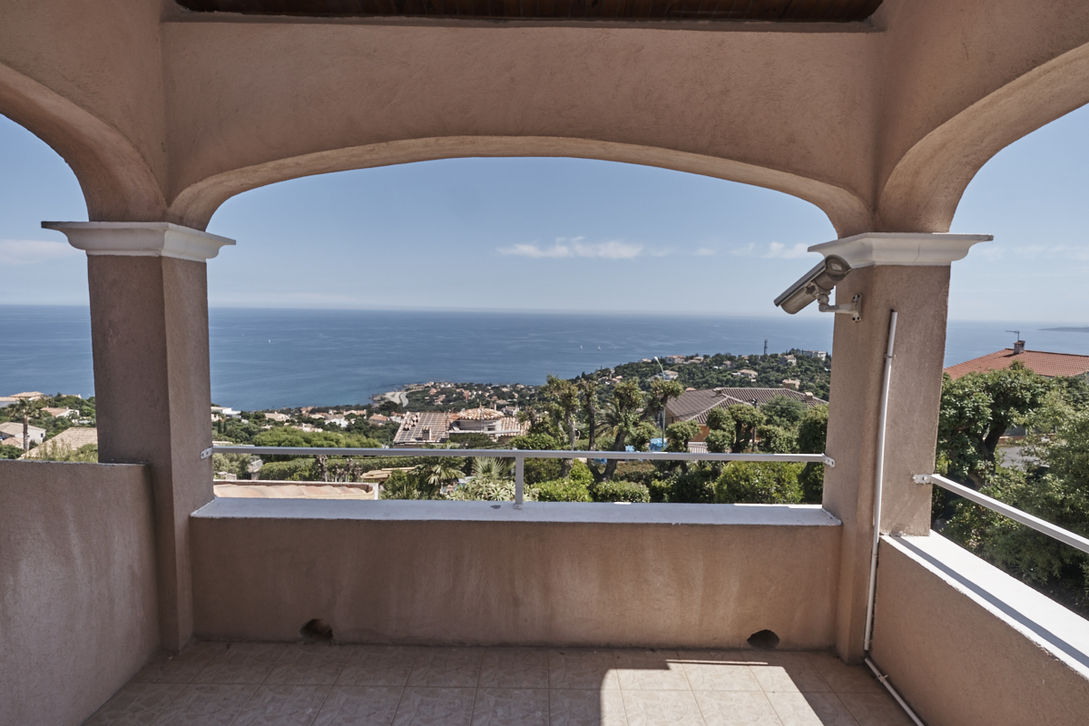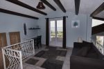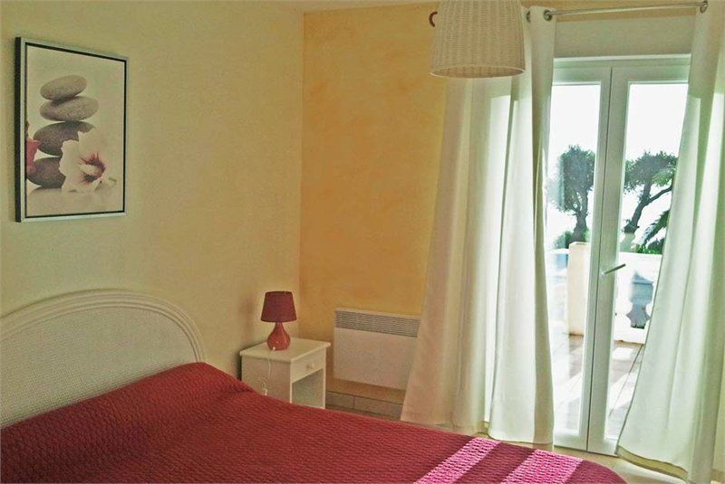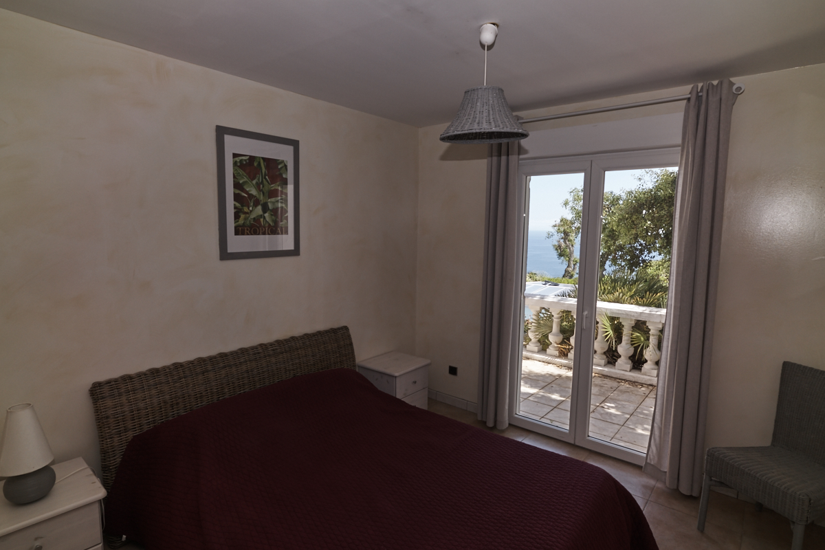 Eine Treppe führt vom Wohnraum in eine offene Mezzanine mit Klappbett und einem Balkon mit weitem Blick auf Frejus und St. Raphael. Neben der Mezzanine liegt ein weiteres Schlafzimmer mit Meerblick, einem französischen Bett (140 cm breit) und einem Einzelbett. Ein Bad mit Eckwanne, Toilette und Waschbecken.