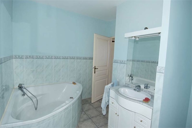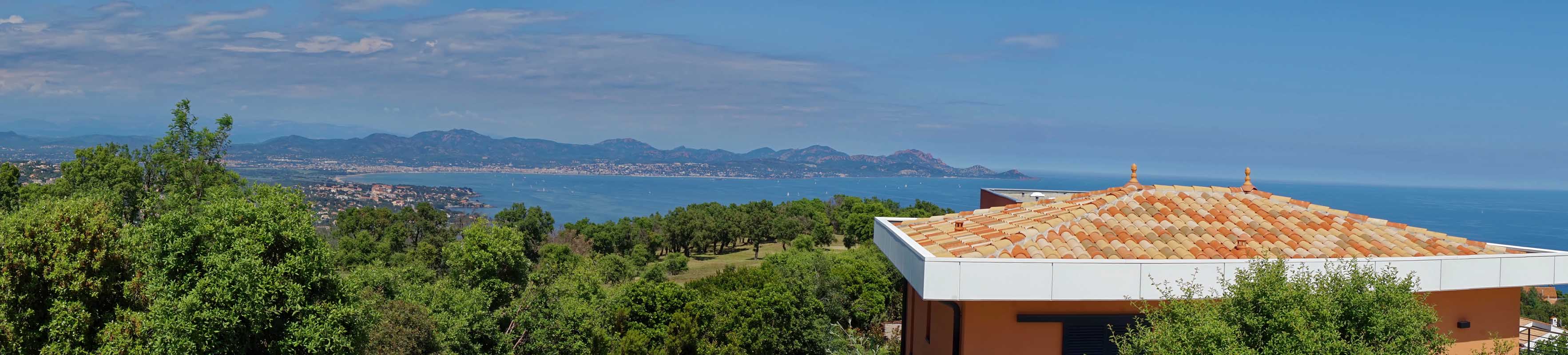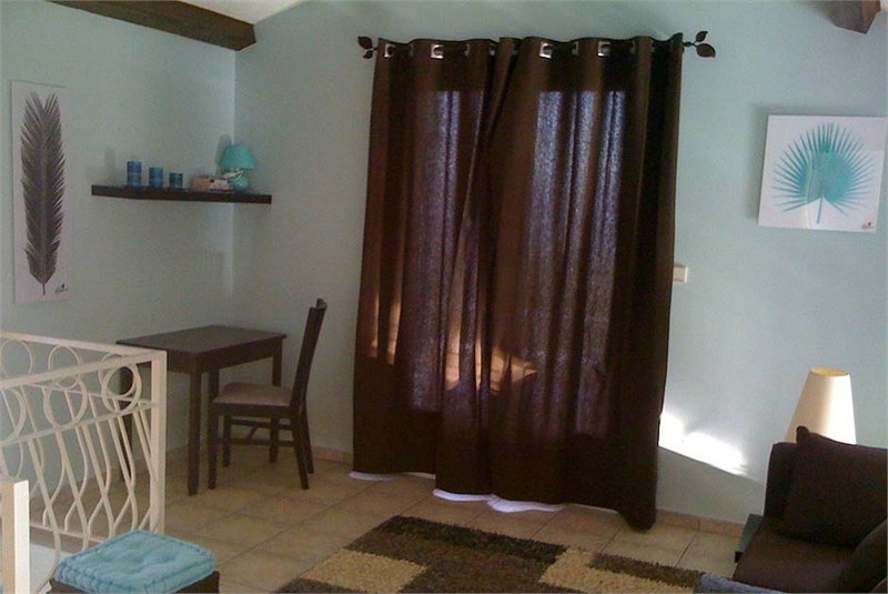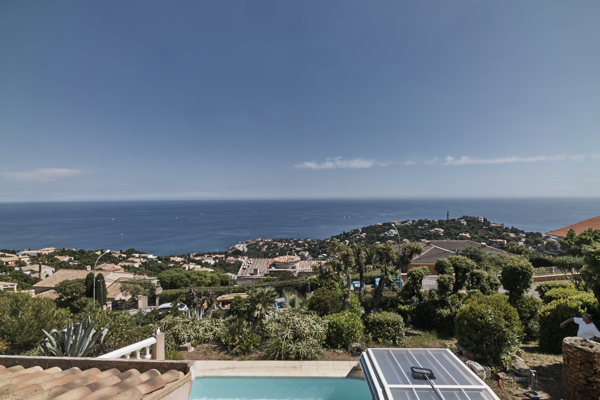 Eine Treppe führt vom Wohnraum in eine offene Mezzanine mit Klappbett und einem Balkon mit weitem Blick auf Frejus und St. Raphael. Neben der Mezzanine liegt ein weiteres Schlafzimmer mit Meerblick, einem französischen Bett (140 cm breit) und einem Einzelbett. Ein Bad mit Eckwanne, Toilette und Waschbecken.
