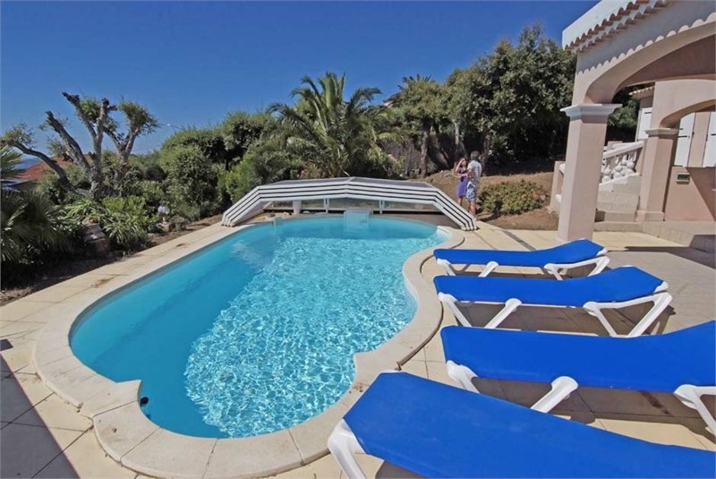 Der Pool hat eine bewegliche Abdeckkuppel. Bei geschlossener Kuppel speichert der Pool tagsüber die Sonneneinstrahlung. Das Wasser bleibt häufig auch in der Nachsaison warm.